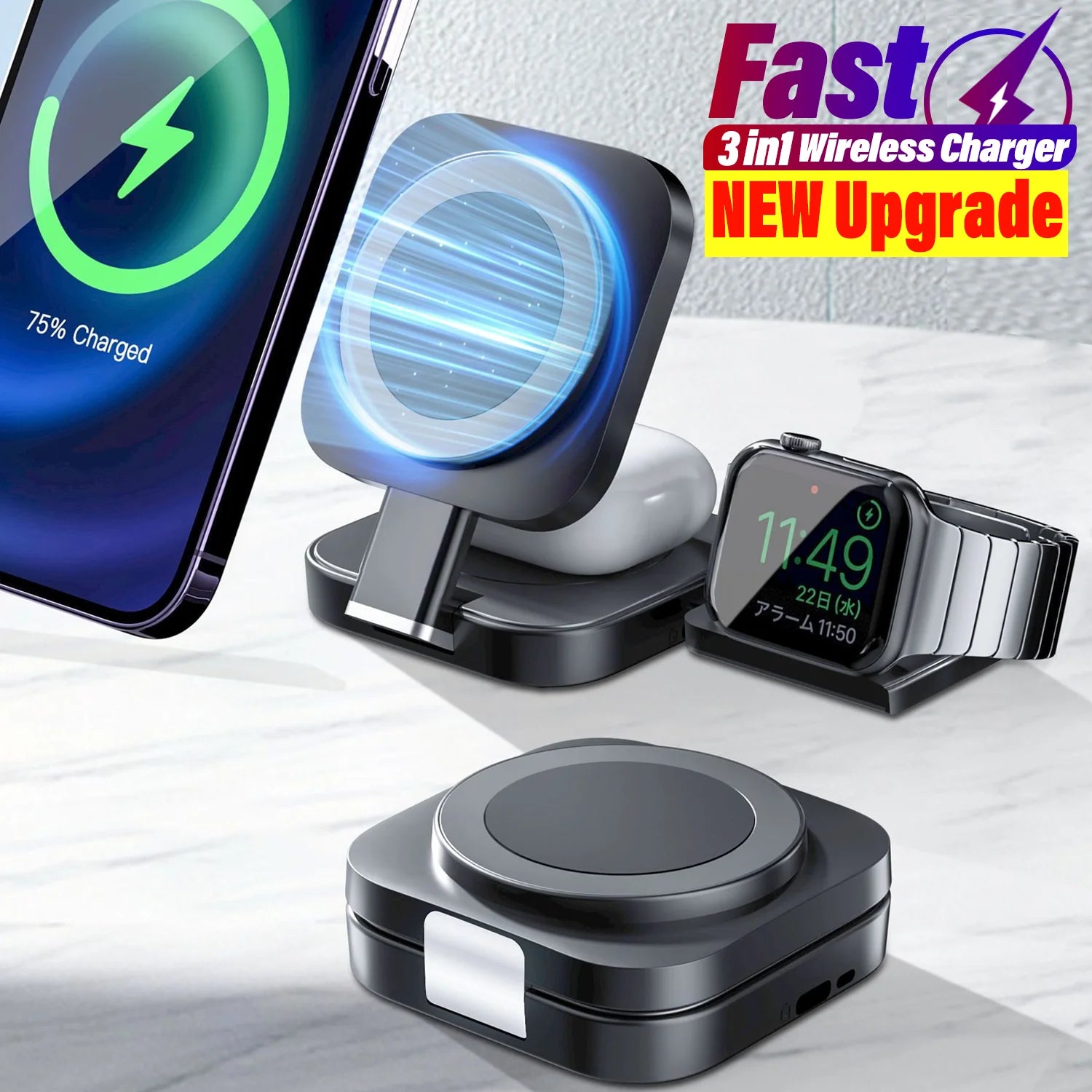Portable Foldable 3 in 1 Charger Station: Power up the iphone 15 pro Max 14/13/12 series in a snap at up to 15W high-speed charging with seamless magnetic alignment via the Apple iPhone for MagSafe charger. After charging 100% at night, it will automatical