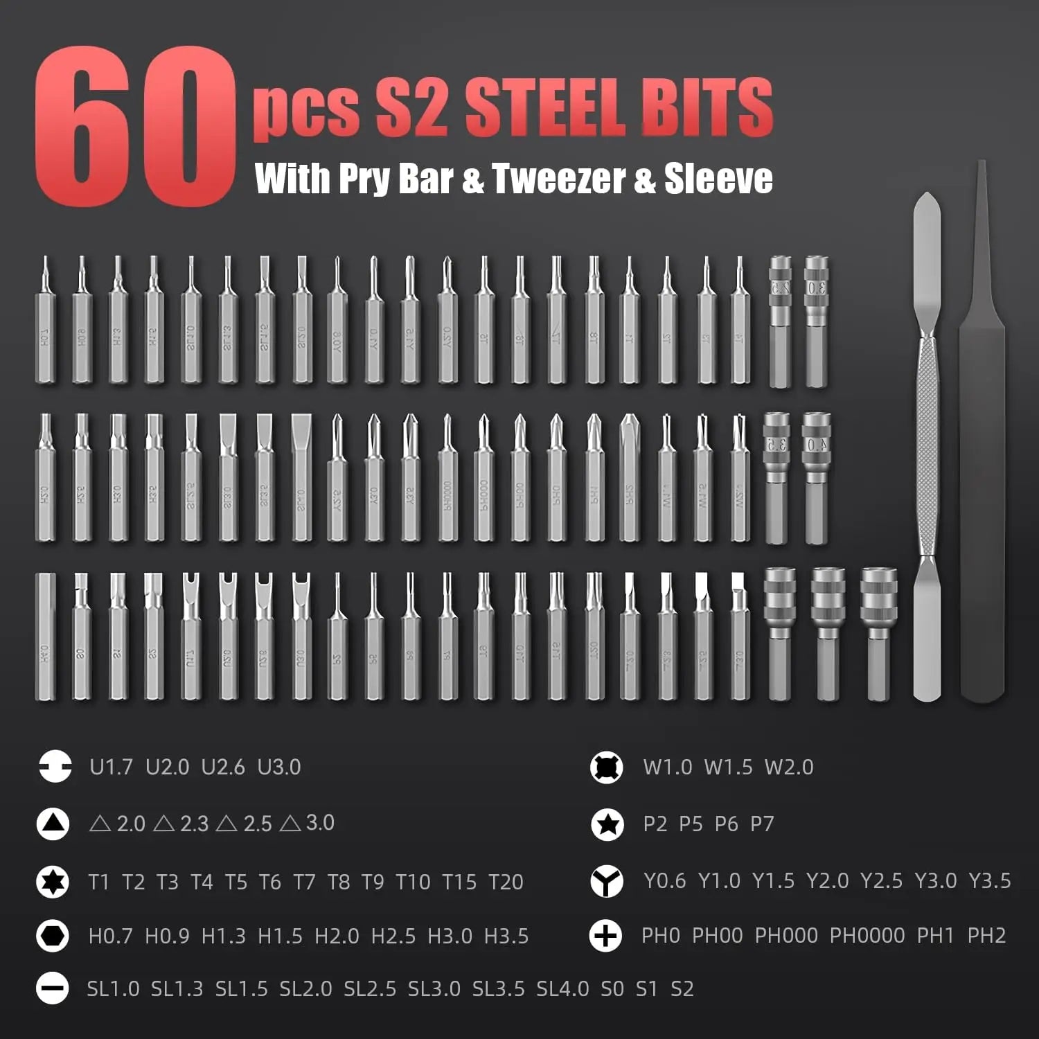 Multi-accessories and multi-application: Equipped with 60 magnetic cutter heads and 7 sockets in 9 categories, it can meet almost all the needs of daily maintenance and home DIY, suitable for gamepads, tablets, mobile phones, watches, cameras, drones and other precision instruments.
