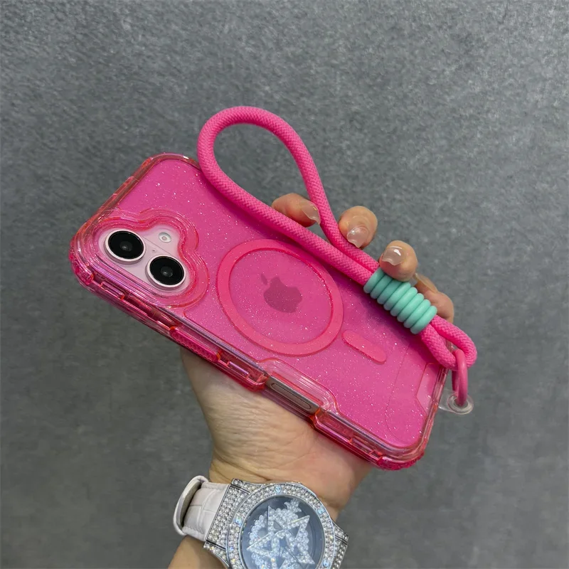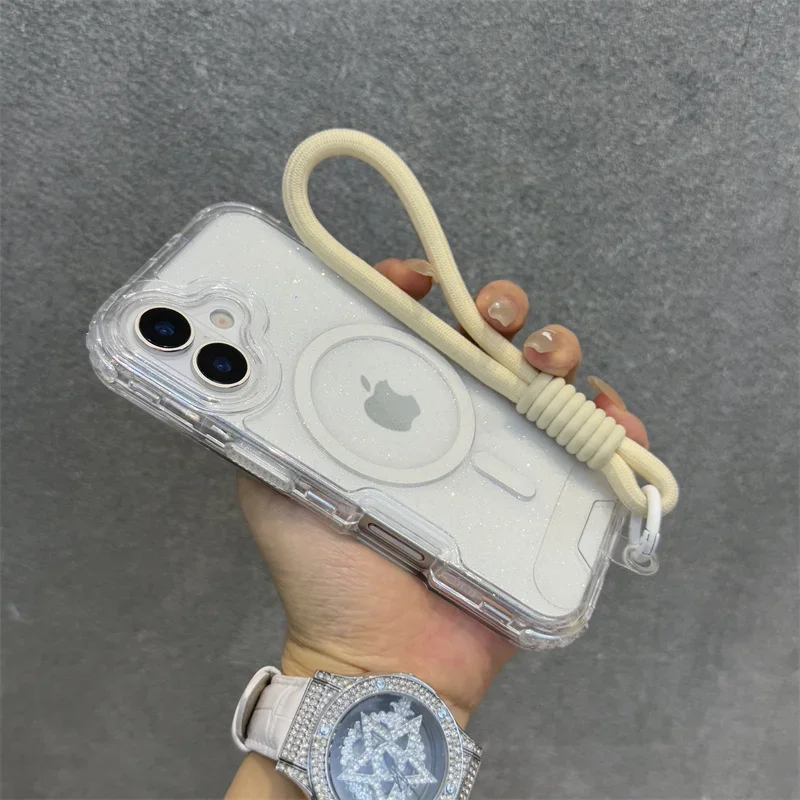 Glitter Transparent Magnetic For Magsafe Case For iPhone 16 15 14 Plus 13 16 Pro Max Wrist Strap Lanyard Shockproof Armor Cover
