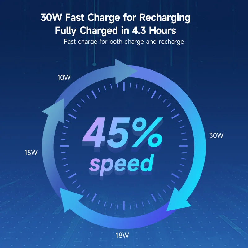 30W Fast Charge for Recharging, Fully Charged in 4.3 Hours