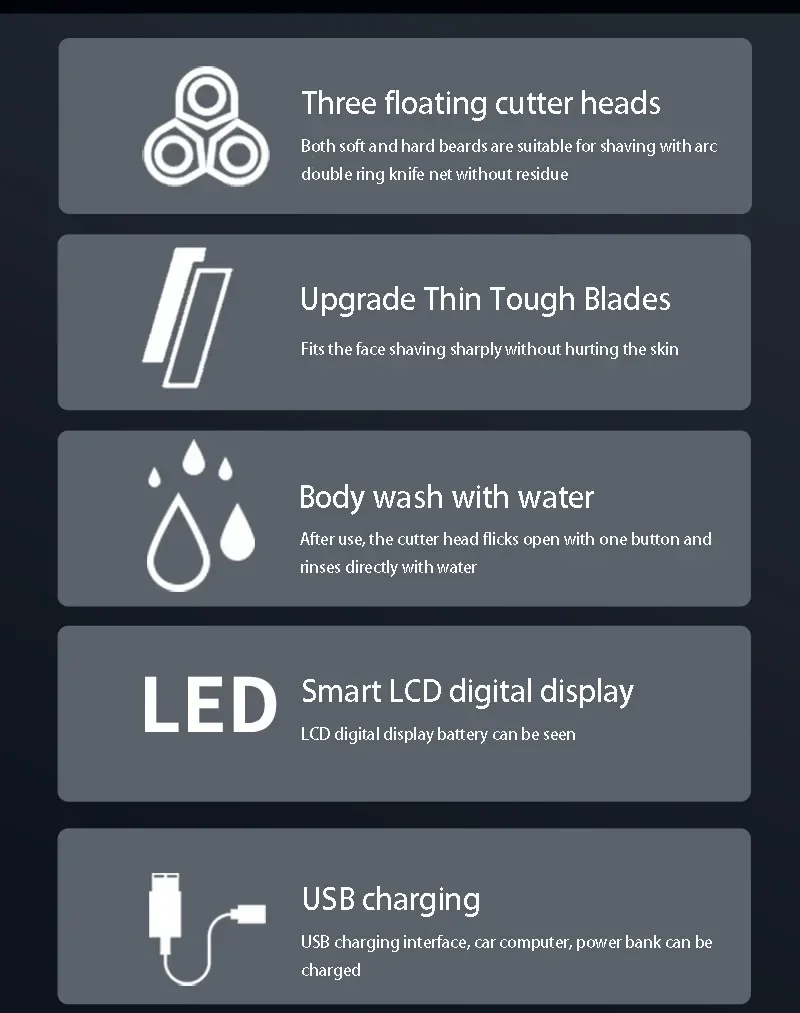 The product has 3 independent floating cutter heads, which increases the shaving area by one third compared with ordinary double-headed shavers to adapt to different contours.