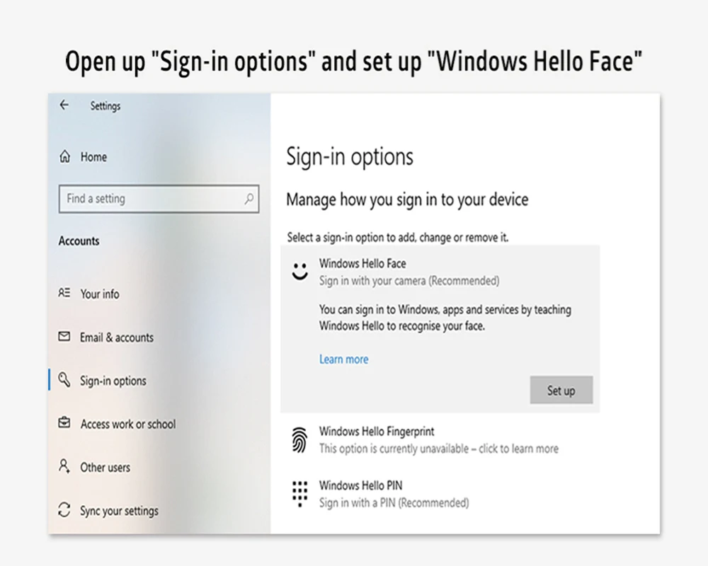 Open up "Sign-in options" and set up "Windows Hello Face"